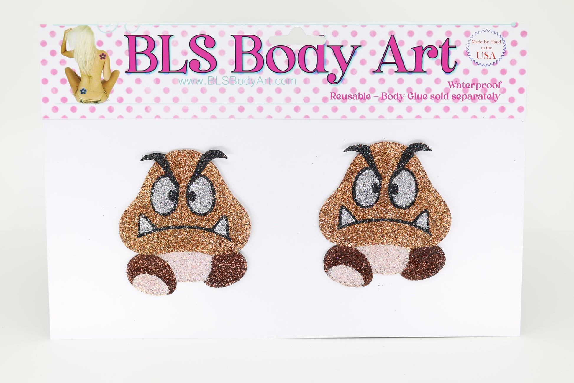 Made by hand in the USA using latex free acrylic based medical adhesive and brilliant cosmetic glitter.