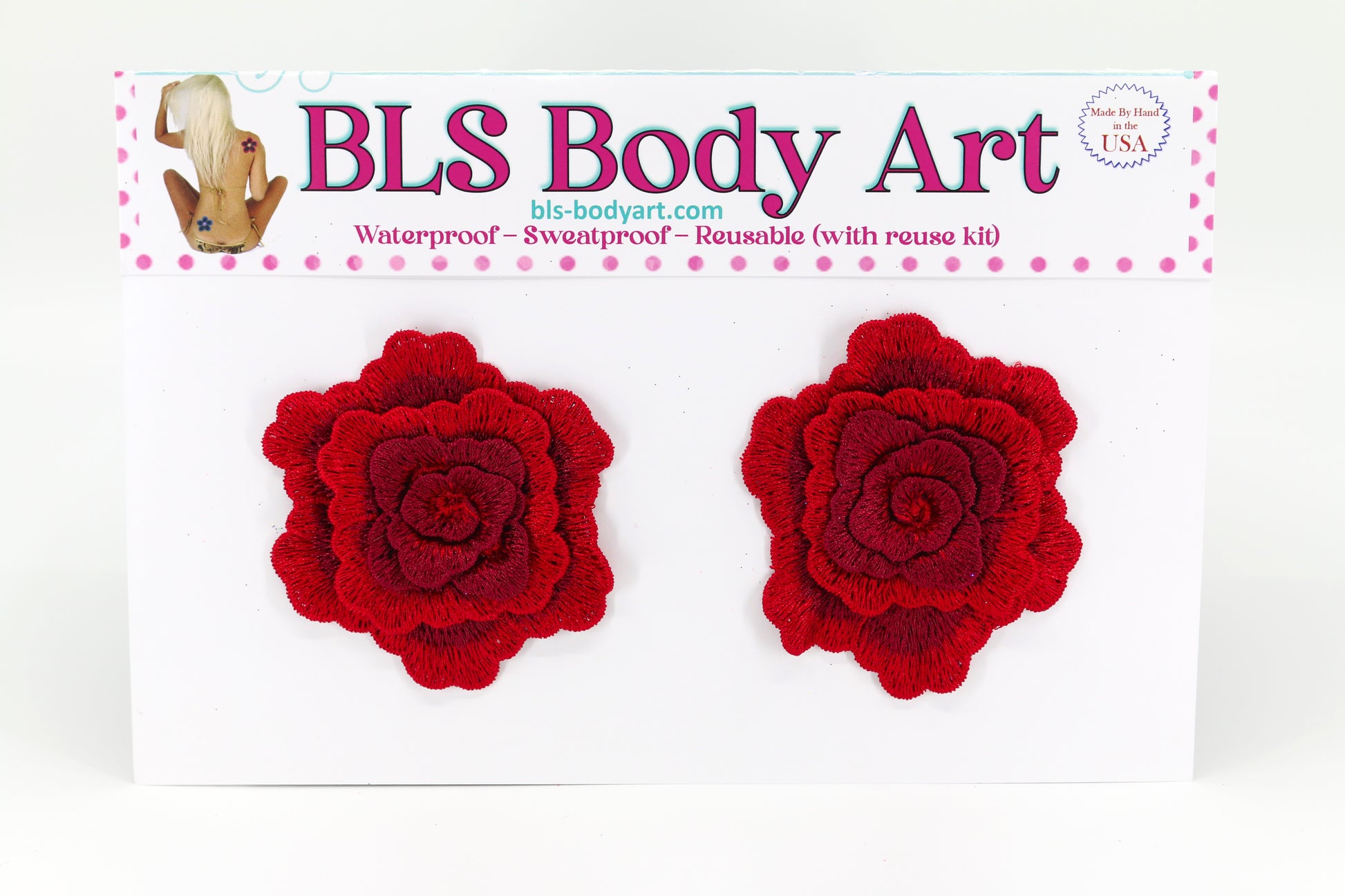 BLS Body Art and pasties are sweatproof and waterproof, offering long lasting reliable coverage. Our second skin material allows for all way stretch which helps prevent wrinkling when applied to curved surfaces.