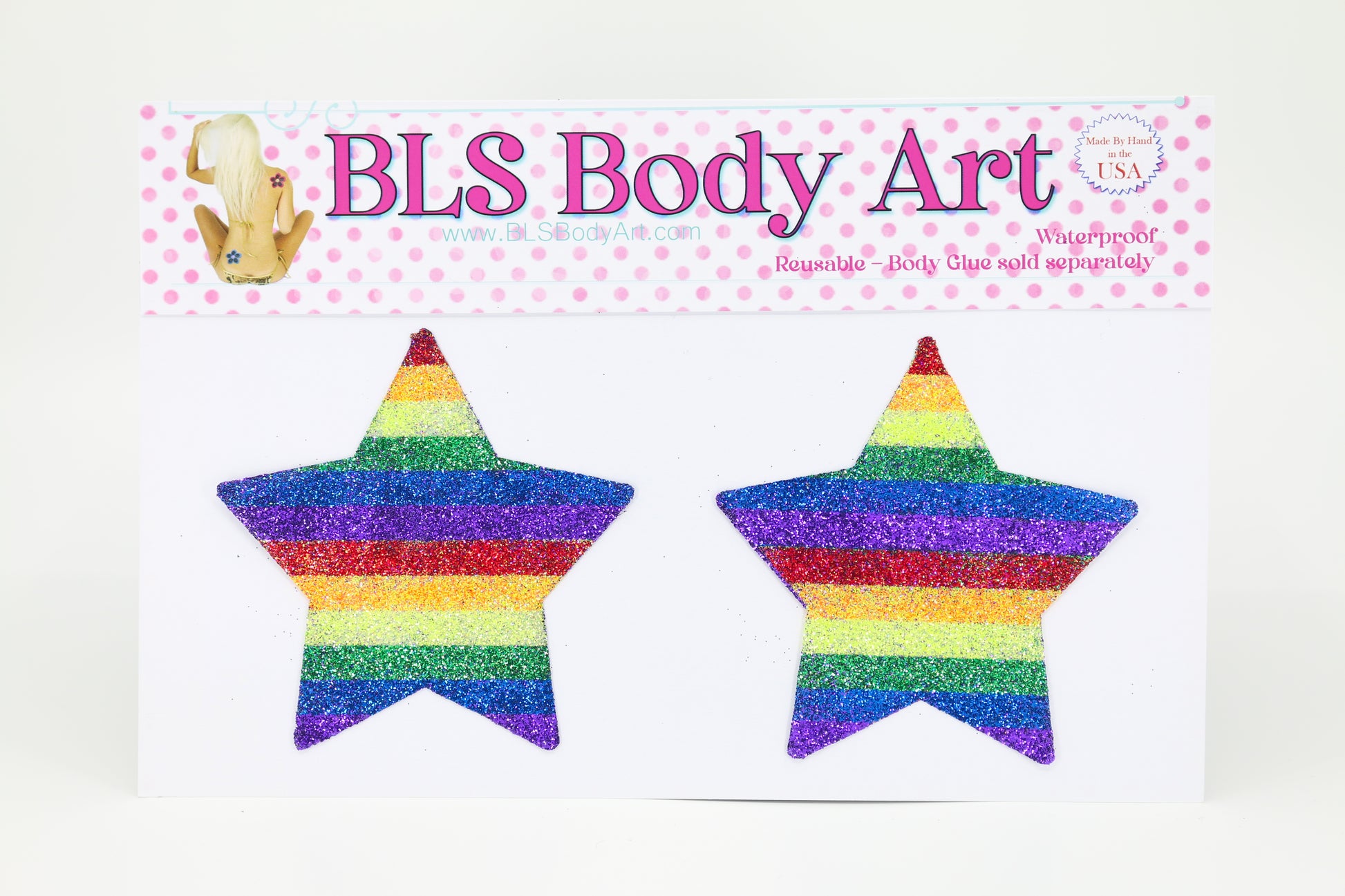 Made by hand in the USA using latex free acrylic based medical adhesive and brilliant cosmetic glitter.