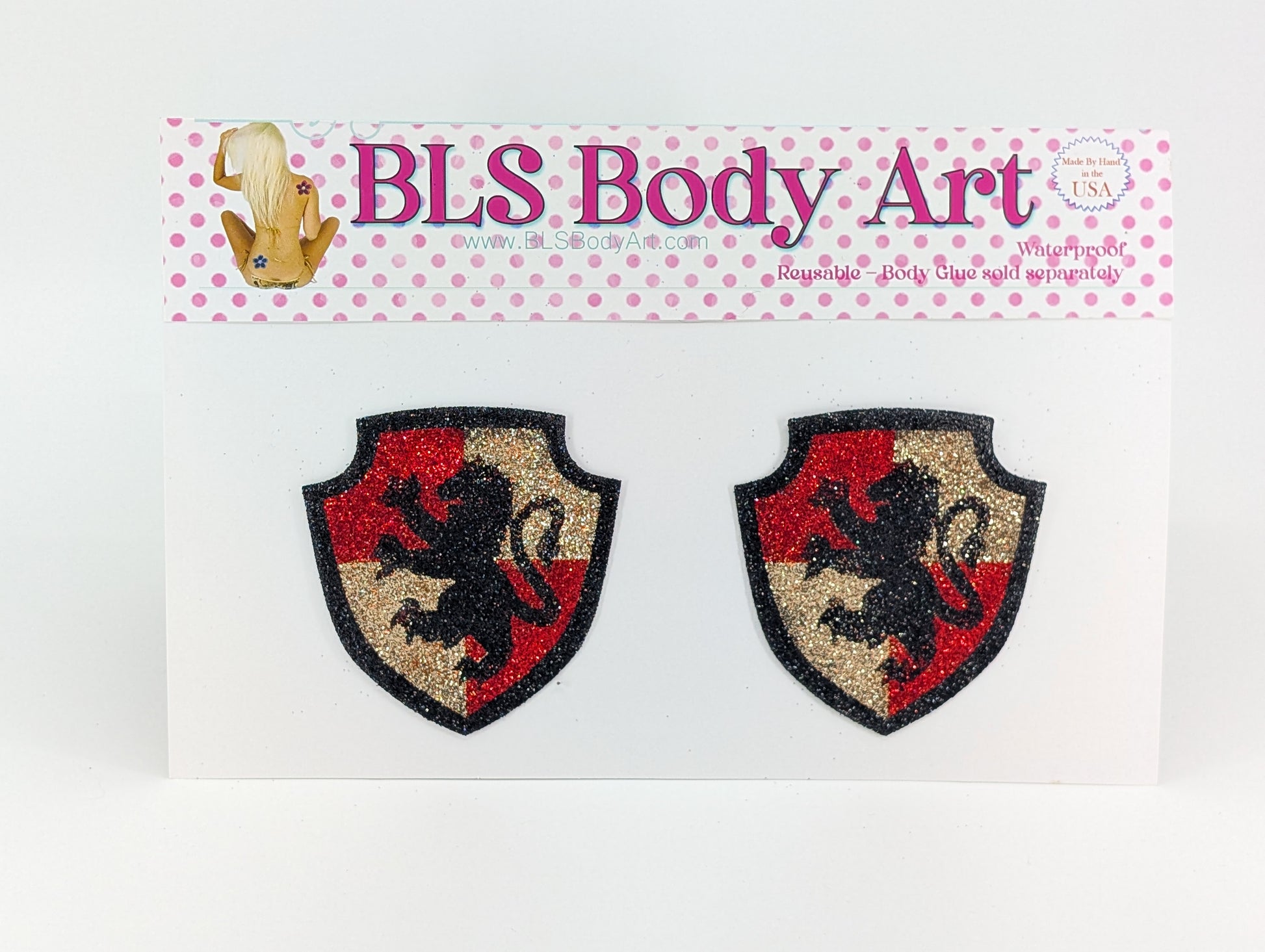 Made by hand in the USA using latex free acrylic based medical adhesive and brilliant cosmetic glitter.